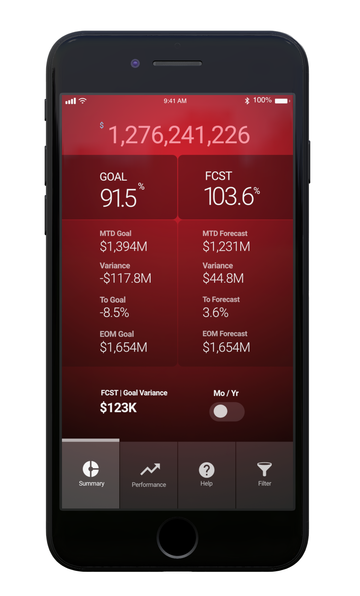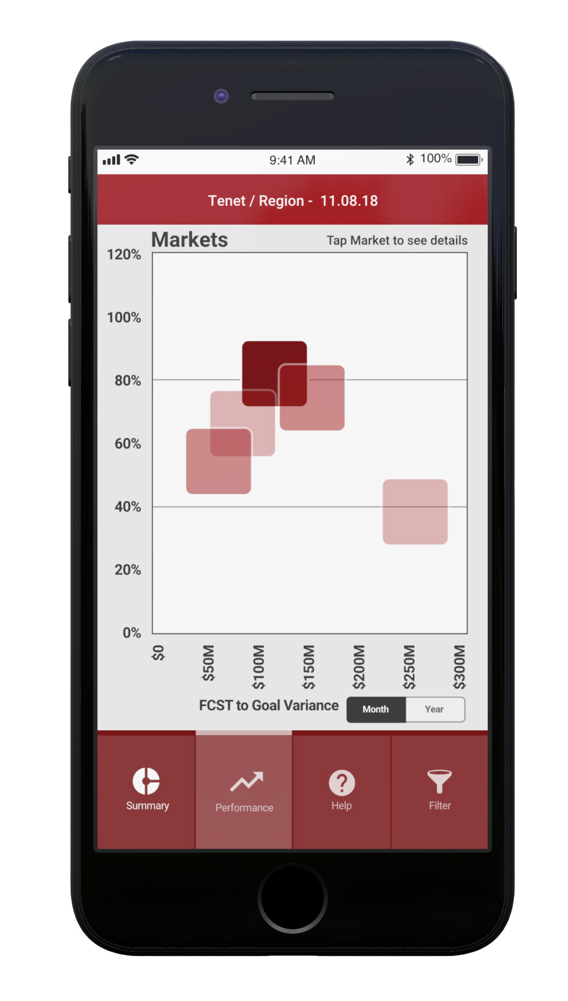 Mobile capabilities are a major advantage, but complex data like charts and grids often don't display well on mobile devices. Instead of replicating full analytics software, my goal was to push key daily insights to users’ mobile devices. For example, a CEO could see at a glance if daily cash flow meets targets, and the app could alert relevant teams if action is needed. Users can also quickly dive into market and regional trends with a simple tap.
